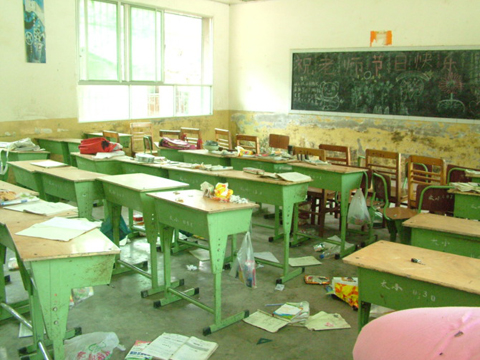 北川县陈家坝乡太洪小学震后教室一片狼籍,可孩子们求知的欲望不会因此破灭。