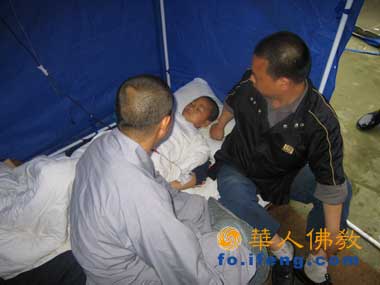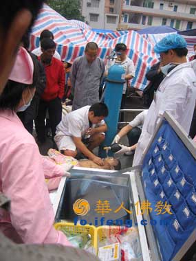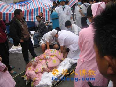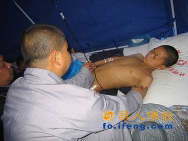 5月15日上午11点56分,素全法师通过手机短信,给华人佛教编辑报道现场情况,短信中说:“包括童忠诚在内的截肢重伤人员目前已经送往成都治疗。”