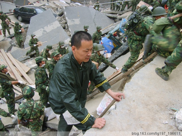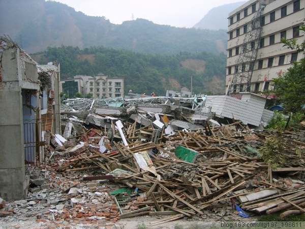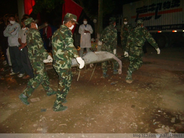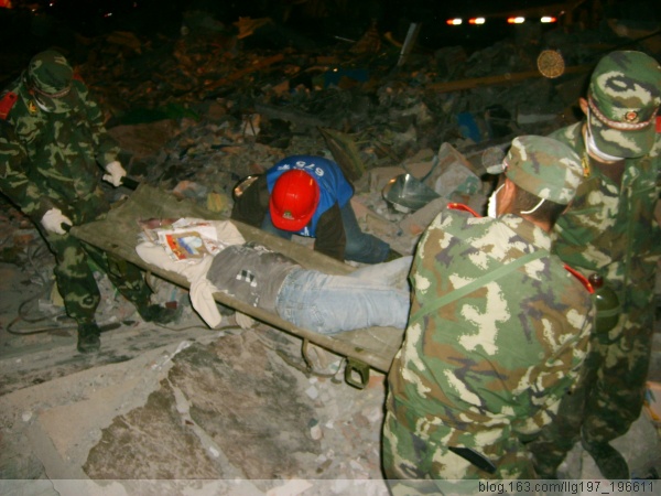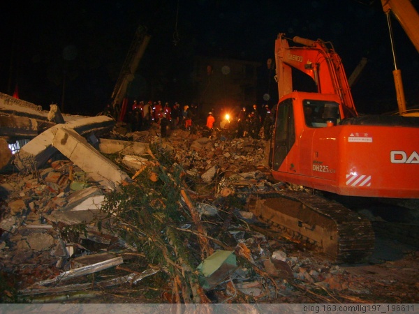 夜幕降临了,但是我们在北川县城的调查似乎才刚刚开始,由于我们进来的时候没有带饭,只带了巧克力和两瓶水,就只好用巧克力充饥了,这时我们才发现北川县中学就在我们旁边,急救工作正在展开,大型的机械轰鸣声吸引了我们,我们立即进入现场,不时的有尸体被抬出来,看到大家与哭无泪的目光,我们手足无措,不知如何安慰大家,尽管官兵在不停的换班,但是还是进展缓慢,终于我们看到了一个女孩被抬出来了,是活着的!!!随后又有两个男孩被抬出来了,其中一个男孩还告诉大家,下面还有三个活着的,好消息鼓舞了大家,许多焦急等待的、已经哭干眼泪的家长也急忙去询问,到十二点的时候,我们共看到六个被活着抬出来的孩子,我们为了第二天的工作,选择去休息,但是没有房屋,也不敢躲在房屋边,只好露宿,尽管裹紧了身上的雨衣,还是非常的寒冷,两点钟的时候,终于找到了一个救灾帐篷,尽管只能坐着,但是比露宿暖和多了,当我们很快进入睡梦的时候,忽然地下猛地一抖,知道是余震发生了,随时发生的余震另我们不敢熟睡,早晨四点五十分的余震让我们彻底醒来,醒来的第一个工作就是去看营救工作怎么样了,经过询问,知道还有200多孩子困在下面,不知死活。