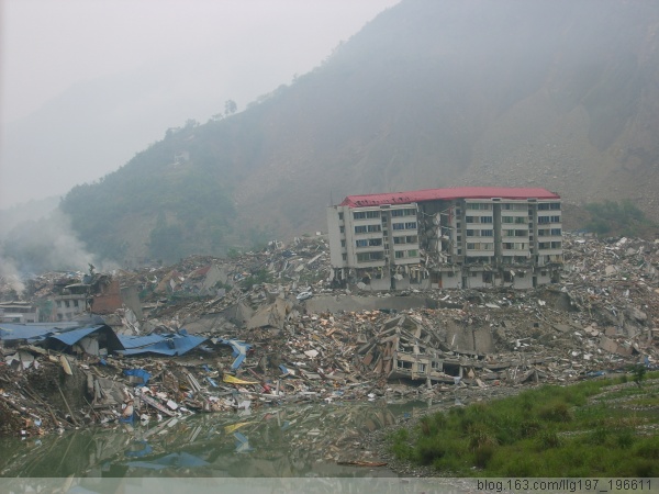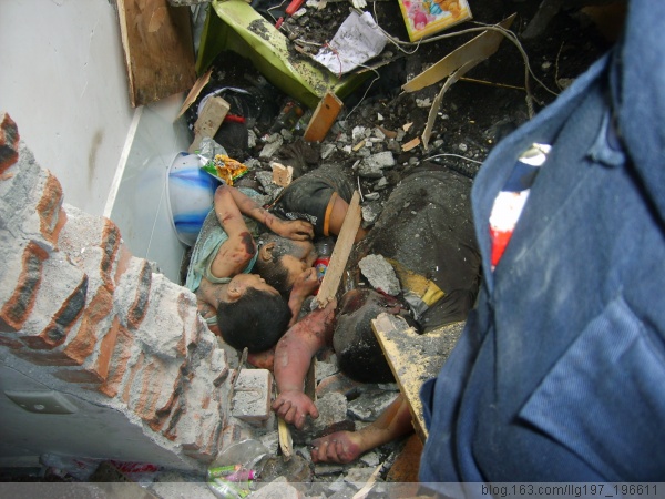 天渐渐亮了起来,我们再次进入北川县城,眼前的景象另人不忍卒睹,整片房屋倒塌,遍地尸体随时可能把我们绊倒,腐臭的尸臭不时折磨我们的忍耐力,山上的石头随时可能掉落把我们砸死,路旁的房子在每次余震都有可能倒塌把我们压进去,我们即迅速又谨慎的进入县城腹地,碰到几个电力局的工人,他们每个家庭都有人死亡,每个家庭都有人失踪,但是他们还在工作,男儿有泪不轻弹,只因未到伤心处,和我们交谈了几句,他们的泪水就忍不住的滚落,并且告诉我们,还有一个学校被滑落的山石整个埋藏进去了,有一个小学还有人活着,我们立即赶往曲山小学,经过一个人的指点和带领,我进入了倒塌的楼房里面,首先看到的是几个孩子被压在了巨大的水泥板下,只露出了头部,很明显已经死亡,带我们进来的先生在抚去一个孩子脸上的泥土,我这时才知道那个孩子是他的儿子。这时怎么样的悲哀啊!继续往里面,有两个小女孩被压在巨大的水泥板下面,只露出了上身,还好,两个孩子很清醒,她们对我喊着:叔叔,救救我。可惜我无能为力,只能是悲哀,我给她们两块巧克力,给她们喝点矿泉水,告诉她们坚持,希望她们坚强的等待救援部队,这又是怎么样的无奈啊!!!幸好部队也赶来了,已经对她们展开救助,祝她们平安,南无大慈大悲观世音菩萨!