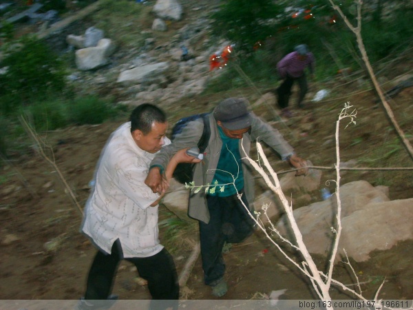 由于我们在这条路不能进入北川,只好返回绵阳,从安县进入,沿途同样见到处处残垣断壁,整片倒塌的房屋,道路无法通行。经过商量,决定由我和重庆华严寺的向春师兄步行绕道进入灾区,我们两个轻装前进,立即绕道进入,还好,路上很轻松的拦到了一辆运送灾民的大货车,载我们一段以后,大货车到达目的地,我们重新踏上了路途,幸好我们还算幸运,又拦住了另外一辆面包车,快到达北川县的时候,面包车也不能前行了,我们只好徒步前进,下午六点钟我们经过一个多小时的跋涉,终于到达了北川县,两旁的山上还在听到沙沙的声音,知道还有泥石流随时可能发生,我们急步进入,路上时时被大石阻住去路,我们艰难的进入北川县城,看到的是整个县城几乎被夷为平地,不时有难民从县城步履艰难地撤出,我们沿途不断帮助那些年老的人爬上山坡,进入县城不久,天色就黑下来了,面对死寂的县城,不知道在哪里可以找到住宿的地方,路旁的已经摇摇欲坠的楼房,似乎在向我们压来,时时有余震在发生,我们只好选择撤出县城,在返回的途中,有一个受伤的老人在步履艰难的转移,我们只好轮流背着她撤出来,三四里路,对于我们来说显得是那么的漫长,随时面临摔进沟壑的危险,当我们终于到达医疗救助车辆的时候,每个人都松了一口气。