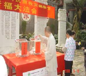 5月18日下午,新兴县国恩寺举行了向四川地震灾区捐款活动, “无缘大慈,同体大悲,自利利他,利乐有情!”这是佛教慈悲济世的精神.我寺积极响应省佛协的号召.发动僧人,信徒踊跃捐款.如禅方丈首先代表国恩寺常住捐款5万元,国恩寺全体僧众2万余元,活动中广州书法家何伯昌居士现场挥毫义卖酬得善款18300.其它居士、信徒捐款络绎不绝,合计募集赈灾捐款107530元。国恩寺将设立专门赈灾捐款箱,为灾区募集更多的善款。长期关注并支持灾区抗灾和重建工作。