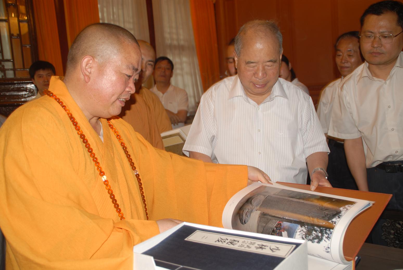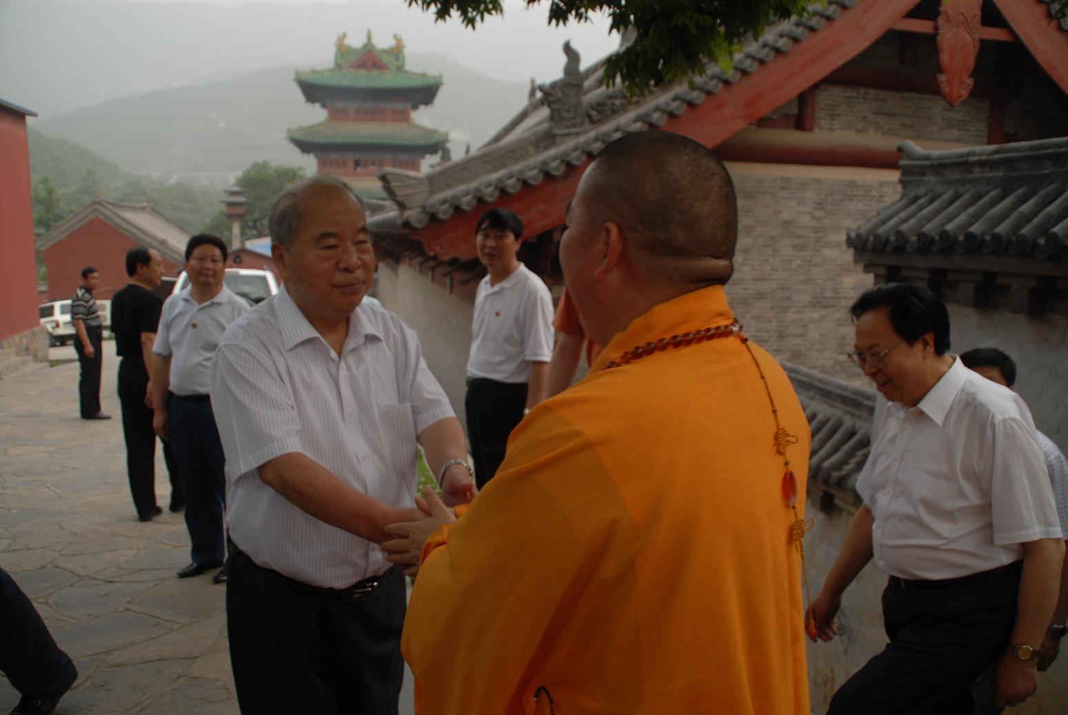 在少林寺方丈室,尉健行与永信法师进行了亲切交谈。永信法师向尉健行详细汇报了少林寺这些年在寺院建设和文化交流方面所做的工作和取得的成绩,并特别汇报了为迎接奥运,即将在北京举行的少林文化展示的情况。