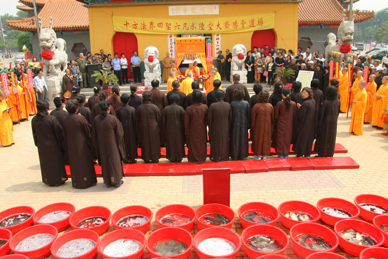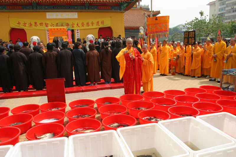 2008年5月22日,天津荐福观音寺第四届水陆空大法会第四天,在前山门广场如法举行大放生仪式。妙贤法师主法,对飞禽水族授予归依并开示法要。近三万条鲤鱼、鲢鱼、泥鳅、乌龟、贝类、青蛙及二千只鸽子、麻雀放施逍遥、得大自在。