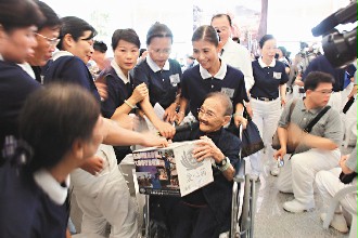 台湾台中慈济医院员工街头募款,证严法师的母亲王沈月桂坐着轮椅,拿着捐献箱向民众募捐。
