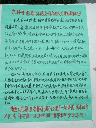 面对如此沉重的灾难,东林慈善功德会本着“无缘大慈,同体大悲”的精神,立即率先在东林寺展开救灾工作,东林寺常住在今天五一佛七圆满结束后,将佛七功德回向缅甸风灾的死难者,超度亡者得生净土,东林慈善基金会立即拨款十万元给东林慈善功德会进行援助,东林寺常住及打佛七的十方信众纷纷解囊伸出手援助灾区人们,并且希望我们的绵薄之力能够帮他们度过难关,冀诸各界社会善心人士发大悲心,随缘布施,所有款项东林慈善将通过中国红十字会转交给灾区人民,截止时间为5月10日。
