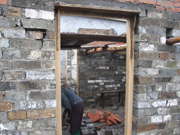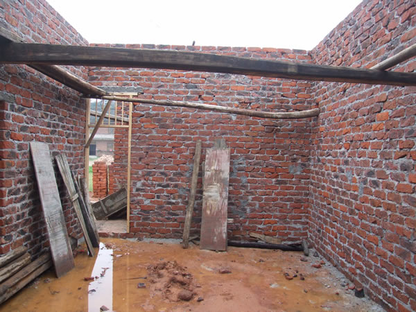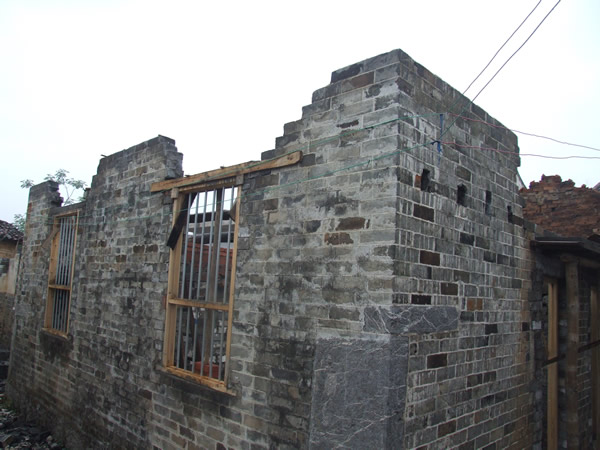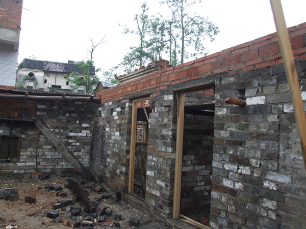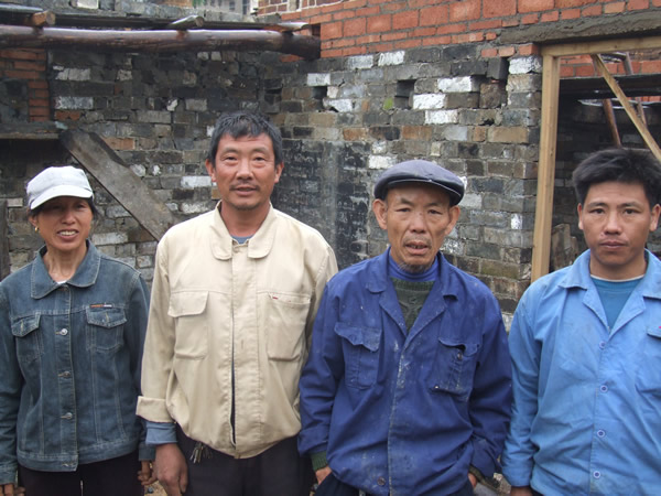 到达永兴后,永兴县民宗局的王局长、廖局长陪着东林慈善功德会一行去到了永兴县三塘乡长湖村。三塘乡有我们援助的四户受灾的家庭,分别是江辉康、江俊河、江俊杰、江公平。进到村子里见到江辉康的时候,他正在重建的楼房底层里忙碌着。眼前的这栋青砖堆砌的楼房一层已经完工,新的木窗也整齐地安装完毕,屋子的结构是八室一厅的两层楼房,房子的面积为二百四十平方米,以后他们四户人家将共同在这栋两层的楼房里安居乐业。