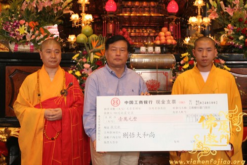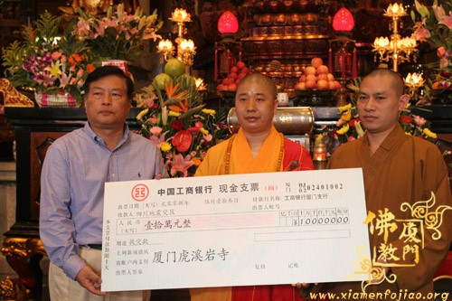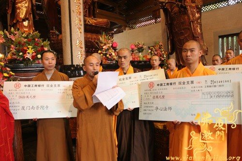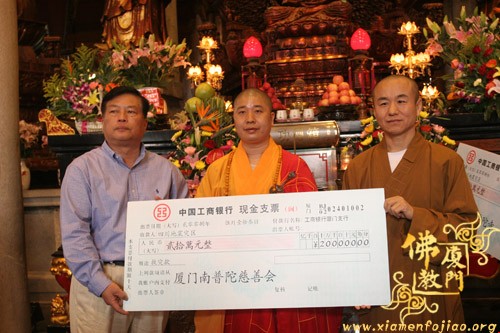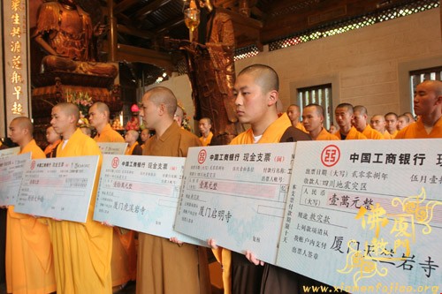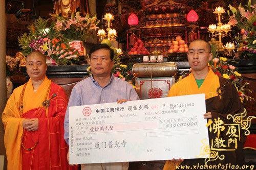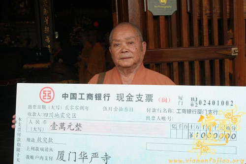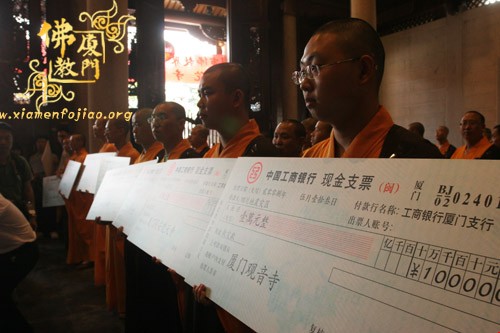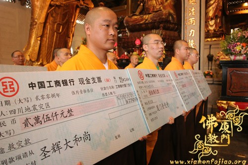 厦门佛教界此次捐款:南普陀寺50万元、南普陀寺慈善会20万元、虎溪岩寺10万元、普光寺捐款10万元等,圣辉大和尚捐款2.5万元,则悟大和尚捐款1万元,了法法师2万元,定恒法师1万元,净心法师1万元等累计为灾区现场捐款118.3万元。此善款将火速送往灾区,与灾区同胞一起度过难关,早日赢得抗震救灾的全面胜利。