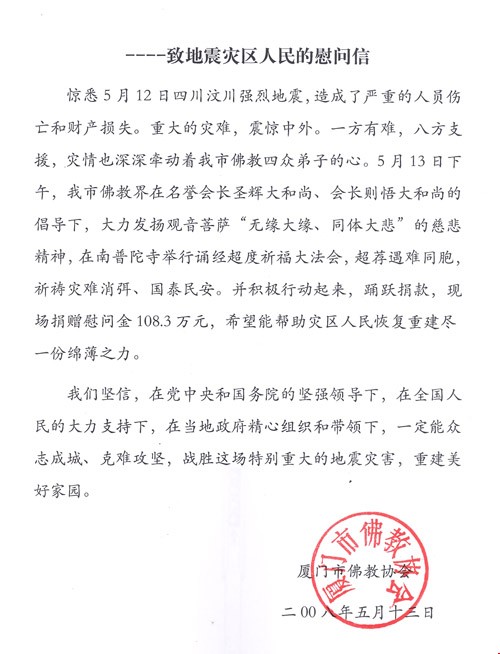 灾情时刻牵动着厦门佛教界四众弟子的心,中国佛教协会副会长、厦门市佛教协会名誉会长圣辉大和尚,厦门佛教协会会长、南普陀寺方丈则悟大和尚,在第一时间紧急召集厦门市佛协领导班子:常务副会长定恒法师、副会长法云法师、秘书长净心法师等共同商议,即刻组织为四川地震灾区同胞捐款、祈福活动。