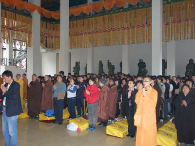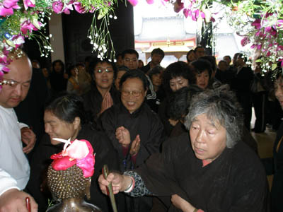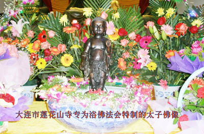 20008年5月12日上午,尽管大连的天气是下着中雨,但是前来寺院参加活动的信众还是络绎不绝,约有近千人参加了大连市莲花山寺举办的庆祝释迦牟尼佛圣诞活动,9时举行放生山雀之后举行浴佛法会,参加法会的居士善信各个法喜充满,在给太子佛沐浴的同时也洗涤自己内心深处的污垢,净化心灵。