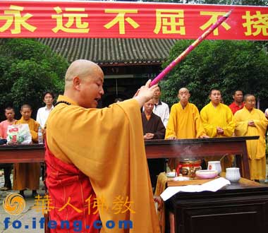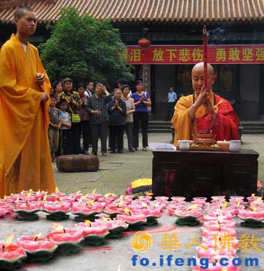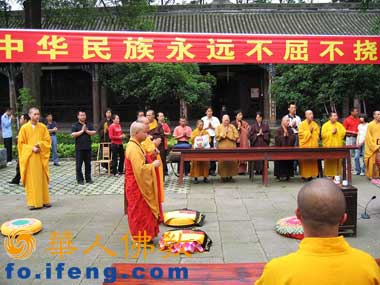 时维中华人民共和国国历2008年4月15日,中华民族又一个国难的日子,素全率什邡马祖罗汉寺全体僧众,满怀无比悲伤的泪水,于佛前以最虔诚的心,为5·12四川大地震死难者超度,为抗震救灾英雄祈福。