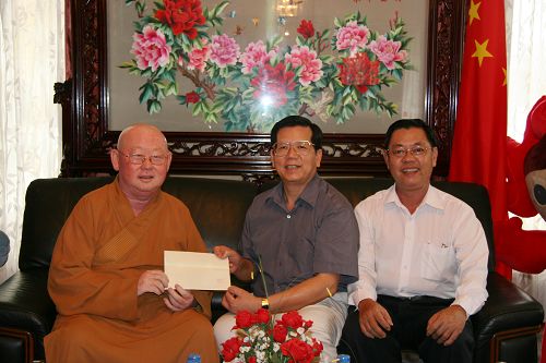 2008年6月2日,胡志明市莲华寺释惟镇法师代表僧众前来中国驻胡志明市总领馆向四川地震灾区捐款一千五百万越币。