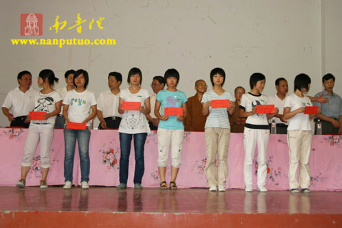 主席台上,普陀法师、果瑞法师以及各级领导亲自为学生颁发助学金,普陀法师还鼓励学生:要好好珍惜学习机会,努力拼搏,将来为祖国、为家乡做出更大的贡献。