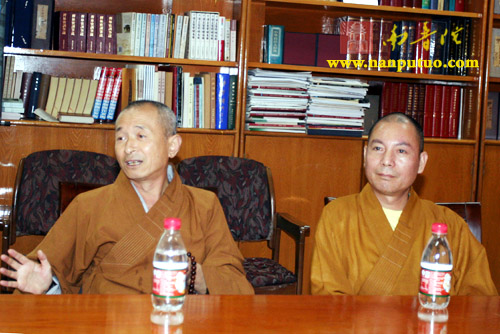 圆智法师(左)、了法法师(右)分别发表各自的见解