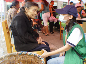 78岁精神受创严重的王道华老先生,是被湖北省武汉公安局特警队王警官率队拆除危房时所发现的,6/22由该队心理师柳警官陪同之下,送往法鼓山在四川什邡师古镇的医疗点接受治疗。由于年轻时工作的不顺,加上父母和儿媳全都早逝,让他把希望和财力全都投注在小学五年级的孙女身上,不幸的是,乖巧懂事的孙女却在512的震灾中不幸罹难丧生,此后老先生便时时幻见孙女在眼前出现,请他带著她去上学,现在老先生每天都要到学校去好几次。