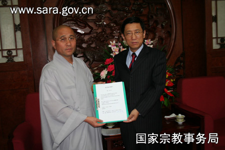 5月29日上午,韩国佛教放送理事长、韩中佛教文化交流协会会长林影潭法师来到国家宗教事务局,代表韩国佛教放送和韩中佛协向中国四川地震灾区捐赠60吨大米,蒋坚永副局长代表国家宗教事务局接受了捐赠证书。