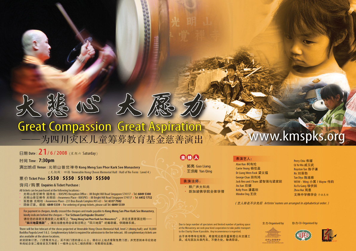 普觉禅寺曾在卫塞节期间收到坡币10万元善款,已交由中国大使馆转交灾区,但广声法师认为这次地震的破坏程度很严重,赈灾应该持续一段时间,因此决定办慈善演出。主办单位对这次筹款不设定目标,却希望越多越好,所筹得善款将通过中国大使馆,转交到灾区作教育用途。