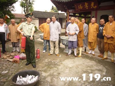 近年来,随着宗教场所用火、用电、用气量的增加,造成古建筑的火灾负载,时刻威胁着古建筑的安全。寺庙一旦发生火灾,就很容易造成“火烧连营”的局面。在消防安全知识培训的过程中,消防培训人员向僧人们讲解了古建筑的耐火结构及注意事项、初起火灾的自救方法、如何报119火警及火场逃生的基本技能。同时,消防培训人员向僧人们示范了灭火器的使用方法,僧人纷纷拿起灭火器跃跃欲试。此外,培训人员联同安监局负责人就宗教场所建立健全消防安全管理规章制度、配齐和定期检查安全设备等工作作了重要部署,并强调各宗教活动场所在全国安全生产月期间,尤其要注重对重点区域和各堂点的电网线路、用电器、消防设备的定期检查,及时排除安全隐患。
