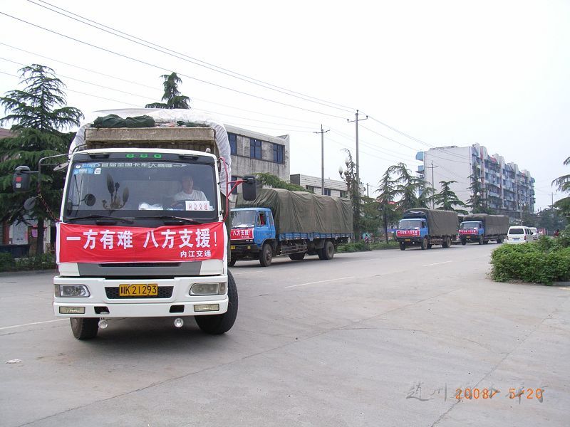 据当地人讲,自从救灾工作全面展开之后,为了保障各种救援车辆顺利地驶入灾区。当地交通部门对于进川的外地车辆进行了管制。由于没有太多时间为货车办理过户手续,所以我们担心无法正常通行。于是,大和尚特意找到一家复印店,将“支援灾区”四个红色大字贴在了车身上。大家希望这样可以顺利地通过有交警管制的路段。