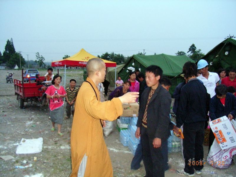 19日下午,为了更迅速地将部分急需的救灾物资运抵灾区,并慰问当地受灾寺院和群众,省佛协副会长、柏林禅寺明海大和尚率领明清法师和恒门法师赶赴四川灾区。本人作为义工也有幸一同前往。其实,早在得知四川遭遇特大地震之初,柏林禅寺僧俗大众便开始着手举办了一系列的“祈福禳灾募捐法会”,为灾区的群众祈福,追荐死难者,并提供赈灾救济。此外,河北省佛教协会于15日和17日先后派遣两批工作人员运送救灾物资直达什邡和江油灾区。