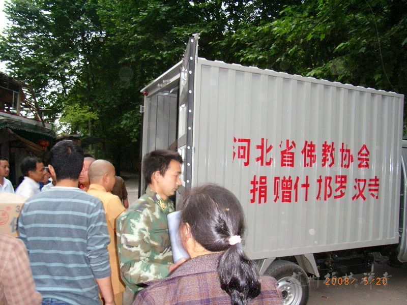 随后,明海大和尚一行与肖占军秘书长、柏林禅寺护法郝居士在川大的招待所里会面,了解灾情。这位北京的郝居士当得知大和尚要前往灾区慰问时,便直飞成都,全力协助。后来的两天内,他发心捐献三十多万元用于购买一辆货车和部分粮食,以佛协的名义捐赠给了灾区。