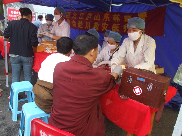 5月24日清晨,东林慈善功德会医护人员一行人来到九洲体育馆开展义诊施药活动。连续几天与晨色相依,与暮色相伴,安排紧密的义诊工作在广大灾民的心中留下了非常良好的印象。第一天的接诊量就达到了近400人。医生们发挥着无私奉献、救死扶伤的精神,用自己精湛的技术为灾民们疗伤。而我们弘法组的法师们则用他们慈悲的胸怀、智慧的语言抚慰着灾民受伤的心灵。灾后家园的重建,身体的健康对他们来说很重要,而走出地震造成的惊吓,恐慌,恢复正常的心理状态对这些灾民而言更重要。思想决定行为,而行为将改变命运,社会对于他们的救助只是暂时的,灾后的生活很大程度上,他们更需要自己坚强,自力更生。我们的法师们用轻言细语为灾民作简单的开示,给他们简单开示这个世间的苦、无常,引导并鼓励灾民用平常的心态面对生活,多念佛,让自己的心灵有个依托。通过法师们简单的开示,这些灾民对自己目前的生活状态有了比较平和的心态,能够能用平常心面对突如其来的灾难。