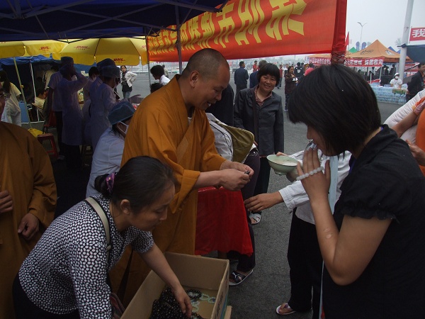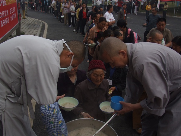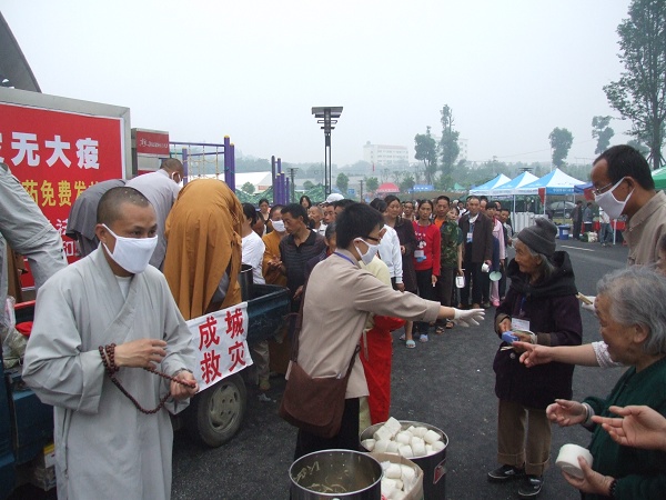 为了能使灾民们在无家可归、无事可做,心灵尚未完全平静的时候能够有心灵的依托,法师们还为大家准备了佛书、念珠、念佛机等结缘品,让看得懂佛书的人可以通过看书转移注意力,让想念佛的人更有信心和力量念佛,无论信佛还是不信佛的灾民,对法师们的善行都表示非常欢喜赞叹。同时。东林寺与重庆华岩寺、绵阳圣水寺的法师们每天在金祥寺为灾民一天不断的煮稀饭,送到体育中心。这些灾民都喜欢吃法师们为大家准备的素食,排起了长长的队伍。当我去了解他们为什么要到这里盛饭时,他们说,因为这里的师父好,我们喜欢他们,就过来了。