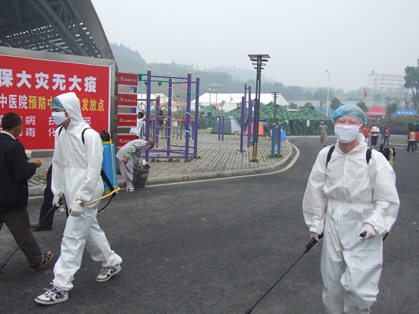 而我们的志愿者们则保持着青春热情投入到消毒防疫工作中去,他们穿着厚厚的白色隔离服,排成一队像刚从月球上下来的宇航员,那种飒爽的英姿让人生起无限的敬意。他们背着装满消毒液的消毒桶,手拿着喷头,开始了辛苦内心却充满自豪和快乐的消毒防疫工作。