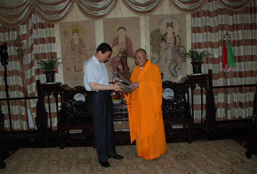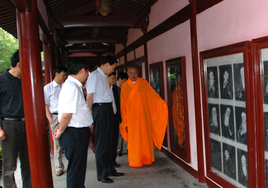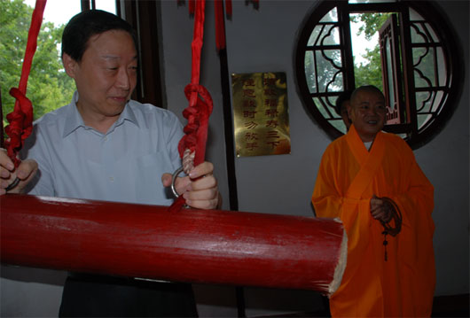 2008年6月10日上午,江苏省长罗志军先生在苏州市委常委、宣传部长徐国强先生,副市长王洪生先生,苏州市民族宗教局局长杨崇华等领导陪同下冒雨视察寒山寺,先后参观大雄宝殿,寒拾殿,法堂,并在钟楼敲钟。在寒山寺方丈室,罗志军省长和秋爽方丈进行了热烈的交谈,一开始罗志军省长就表示出浓厚的兴趣,关心寒山寺的发展。秋爽方丈向罗省长介绍了寒山寺的建筑历史和深厚的文化底蕴,重点突出了寒山精神、张继的《枫桥夜泊》诗、大钟大碑、29届听钟声活动等等,当谈到2007年寒山寺赠送和合钟到台湾佛光山道场时,罗省长给予了十分的肯定,并指出这是你们做了一件很好的事。交谈结束后,罗省长在留言本上签字留念。