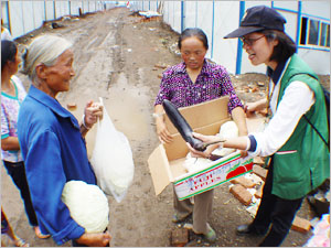 自15号救援团团长果品法师深入海拔千米的陈家坝乡,并指示尽速采购蔬果粮食,协助民众生计后。今日在重庆华岩文教基金会的协助下,顺利将首批包括高丽菜、蕃茄、苦瓜等民生物资,运抵该乡严重受创灾害区域,协助受灾户暂时度过难关。许多羌族居民,纷纷揹负起竹篓、纸箱,依序前往排队领取,领取时人人脸上都洋溢出愉悦的神情。法鼓山预估还要增添一批文具、衣服、鞋子将于近日整理完毕后,送至该乡。