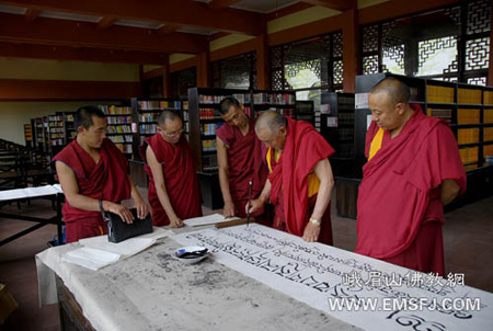 在峨眉山大佛禅院,峨眉山佛教协会会长永寿法师热情接待了戈教仁波切一行,并陪同参观了大佛禅院。参观过程中,永寿法师就大佛禅院的历史沿革和寺院规划布局等向客人们作了详细介绍。在参观峨眉山佛教图书馆时,戈教仁波切一行对图书馆丰富的藏书深表赞叹,牛麦郎加仁波切还即兴赋写藏文偈语一首,赠送给峨眉山大佛禅院。