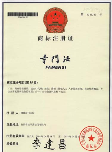 法门寺考虑到有些商品(如烟酒等)不符合佛教精神,或产品质量有问题,有损法门寺的诚信。2005年,法门寺领导小组多次讨论决定,委托陕西国一商标事务所有限公司向中华人民共和国工商行政管理局商标局对“法门寺“进行45类商标注册(保护性全面注册),2008年1月至4月,有23类商标获得国家商标局批准(分别是第1、2、3、4、5、14、15、16、17、19、20、21、35、36、37、38、39、40、41、42、43、44、45类),其余部分将陆续批准。