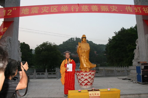 5月29日晚,在三祖寺山门广场举行了为灾区祈福募捐传灯法会,有数千僧俗群众参加。广场上用莲花灯摆成了巨大的“心”字,内有“汶川”、“5、12”这令人揪心的两个汉字与数字。法会上僧众领诵经咒、为灾区祈福,众人也纷纷解囊,捐资救助。