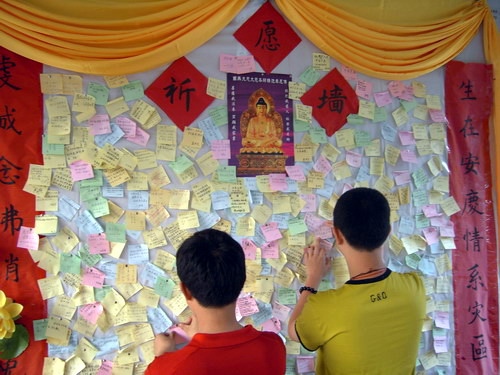 法会特设的祈愿墙上贴满对灾区人民的美好祝福