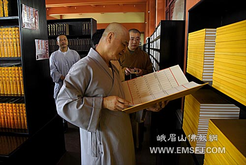 广声大和尚翻阅峨眉山佛教图书馆藏书
