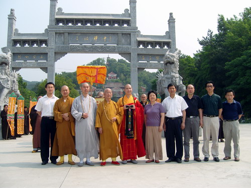 5月22日,安徽省佛教协会会长妙安长老率省佛协副会长兼秘书长智文法师、副秘书长陈慧锋,在安庆市宗教局局长黄晓玲及潜山县统战、宗教部门有关领导陪同下,来三祖寺视察。省佛协副会长、三祖寺住持宽容法师率两序大众在山门广场隆重迎接妙安长老一行的到来。