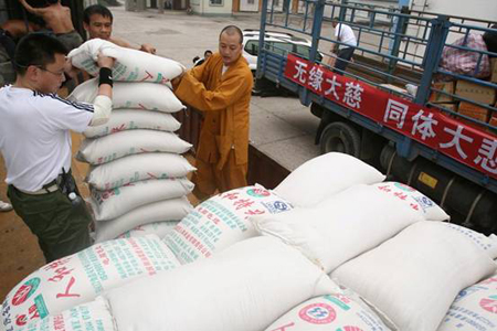5月16日9点51分,救灾物资车到国家储备粮库,装运30吨救灾大米。这是华严寺运往灾区的第一批救灾物资共2车,其中一辆装有矿泉水、药品、方便面、榨菜、棉被。