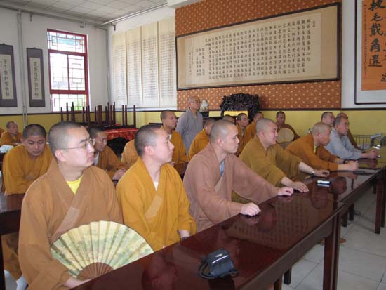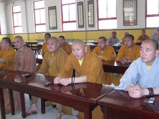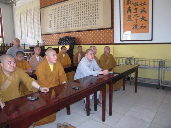 2008年6月11日上午9:30分,大悲禅寺常住僧众在斋堂一起观看抗震救灾英模事迹报告团首场报告会。