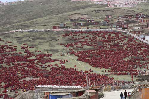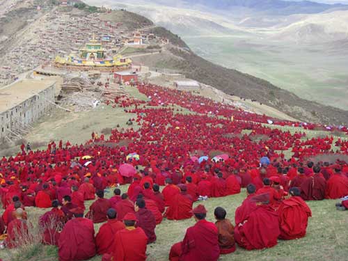 二00八年五月二十五日四川省色达喇荣五明佛学院及周边寺院的僧众以沉痛的悲伤哀悼在五·一二汶川大地震中遇难者举行了万人超度和祈愿大法会。原死难者往生西方极乐世界!幸存者得佛菩萨垂念加被身心安康并祈愿世界和平!人民幸福安乐!