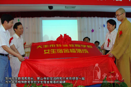 2008年6月20日下午,苏州寒山寺妙定法师、寒山寺慈善中心常真居士和苏州市宗教局周远哲等一行,赴大丰市参加大丰市特殊教育学校20周年校庆暨女生宿舍楼落成典礼。