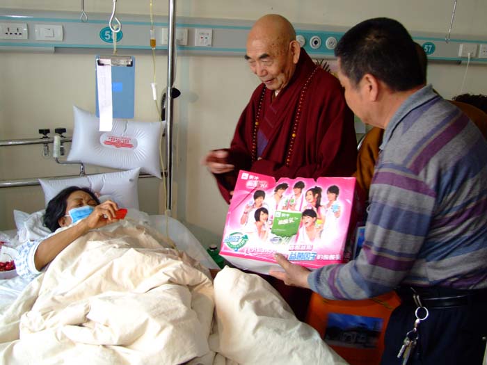 青岛湛山寺主持明哲长老到海军401医院慰问受伤住院的灾民