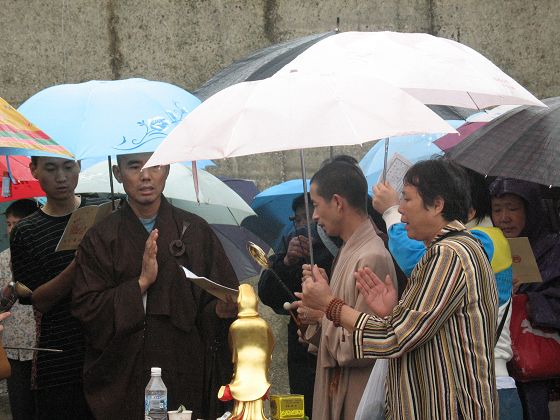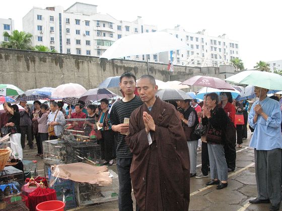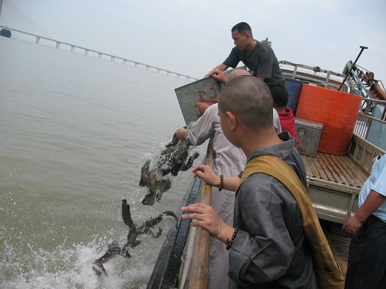 2008年6月22日,天气非常闷热,东林寺护生会在湖口举行放生活动,就近信众随喜参加。来普师主持放生仪轨,在大众悠扬的诵经声中,佛菩萨慈眼悲视苦难众生,降下甘露。