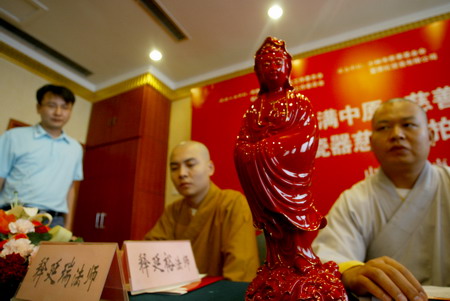 由少林寺方丈联合海内外107名高僧开光的12件富贵红佛像瓷器将于7月23日在郑州拍卖,所得善款将为少林寺慈幼院的孤儿们建一座图书馆。这是记者今天上午从“关爱满中原,慈善助未来”富贵红佛像瓷器慈善义拍新闻发布会上获悉的。
