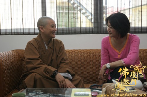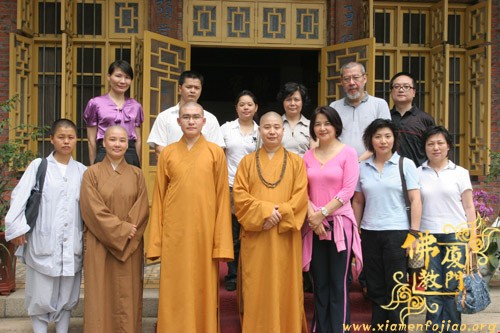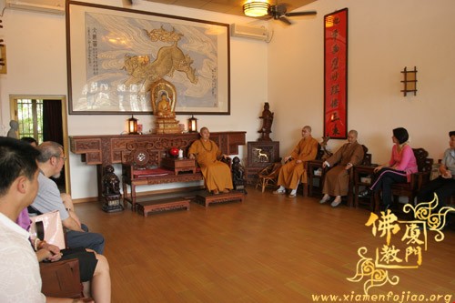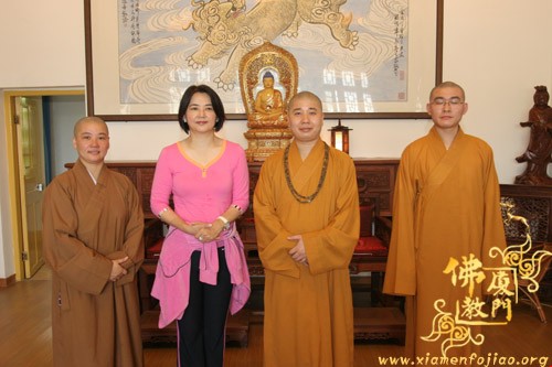 南普陀寺维那兼知客圆满法师、进明寺住持普端法师引领胡慧中一行拜访方丈则悟大和尚