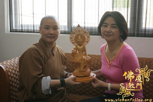 6月30日,国际影星胡慧中一行在进明寺住持普端法师、铭爵山庄(厦门)房地产开发有限公司董事长庄紫帆、厦门体育总会副秘书长连绵、建设银行文园支行行长钟月芬等的陪同下,到厦门南普陀寺、进明寺朝礼。