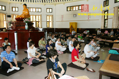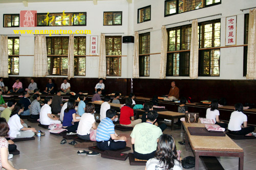 11时,学员们随我寺僧众过堂用斋。下午1时30分,由传明法师负责教授学员。法师先在讲堂为他们讲述禅修的理论,之后于禅堂指导学员进行禅修实践并作开示。