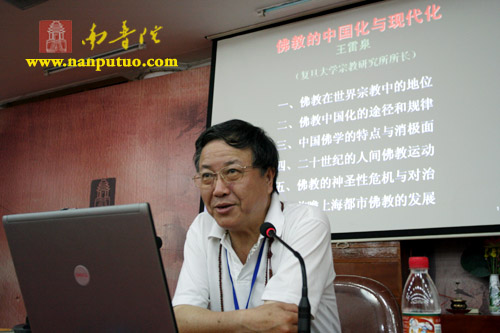 晚7时许,王雷泉教授在讲堂进行题为《佛教的中国化与现代化》的讲座。本次讲座内容分为:一、佛教在世界宗教中的地位;二、佛教中国化的途径和规律;三、中国佛学的特点与消极面;四、二十世纪的人间佛教运动;五、佛教的神圣性危机与对治等几个方面。讲座期间,王教授妙趣横生的语言、独特新颖的观点,让现场不时响起热烈的掌声。
