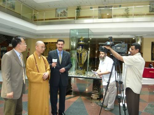 中国宗教代表团的到来引起了大会媒体的高度关注,沙特政府主办的TV ALEKHBARIH电视台和沙特国家电视一台分别采访了学诚法师、陈广元会长、张继禹副会长,请中国宗教界领导人畅谈来西班牙参加“全球多宗教对话大会”的感想和对大会的期望。学诚法师、陈广元会长、张继禹副会长都愉快地接受了采访。访谈节目于当晚便在沙特国内电视台播出。