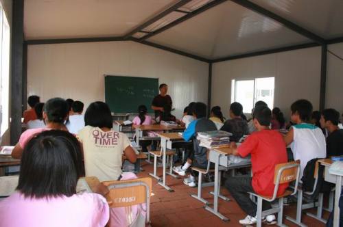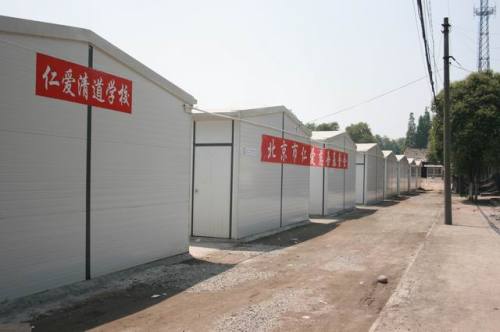 基金会除了积极推动“仁爱学堂”的工作外,5月23日第一批向绵竹分管教育的侯副市长提出了尽快援助彩钢结构过渡性校舍的申请,并和紫岩小学达成了捐建意向,最后在市政府和教育局统一协调下,共签订了8所小学7所幼儿园,折合8540平方米教室面积的彩钢结构、校舍的捐建。到7月7日为止,已经全面完工,一万多名的师生将从此可以回到敞亮的课堂上。