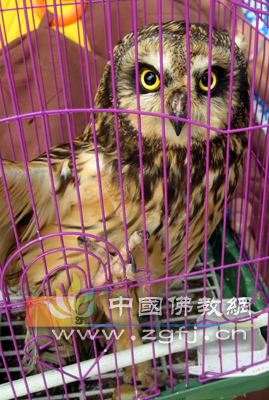 6月28日上午,宝轮寺僧人从一商贩手里“抢救”出一只受伤猫头鹰。看到猫头鹰翅膀上的血肉外露,展翅难飞,如果这样放生必定会断送猫头鹰的性命,于是他们当机立断联系到当地野生动物救助站,将受伤猫头鹰立即送去救治。希望猫头鹰能早日痊愈,重返大自然。